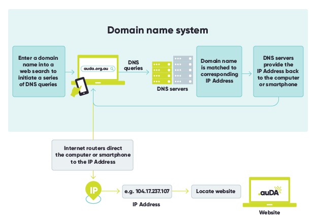 - The org.au DNS nameservers locate the servers (known as authoritative nameservers) that contain the IP address for the website associated with the auda.org.au domain name